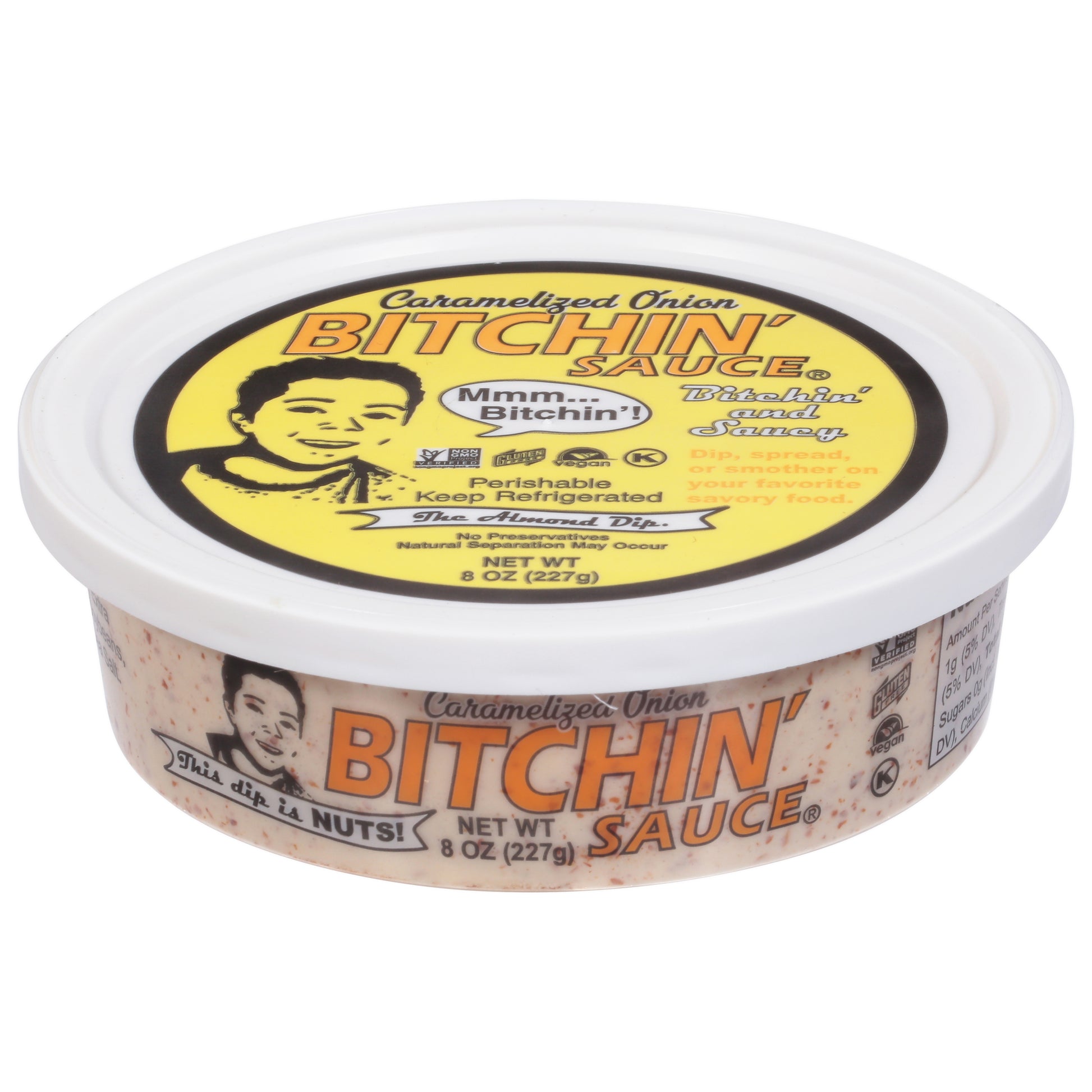 His dip is nuts! Mmm - Bitchin'! Bitchin' and saucy. The almond dip. No preservatives. Natural separation may occur. Family owned and operated. Made with love.