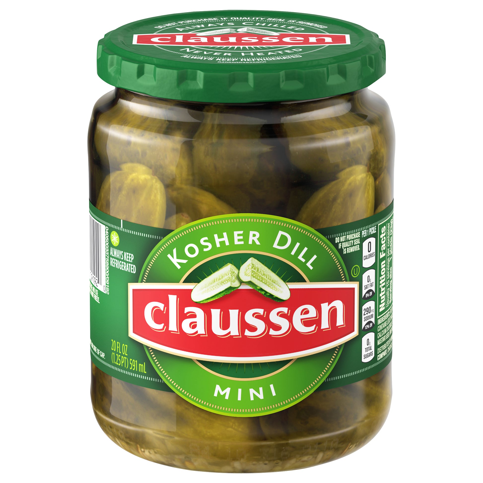Per 1 Pickle: 0 calories, 0 g sat fat (0% DV), 290 mg sodium (12% DV), 0 g total sugars. Always chilled. Never heated. Claussen Kosher Dill Pickle Minis deliver just the right amount of crispy crunch and flavorful kick to your favorite sandwiches. Stored in a brine seasoned with turmeric, garlic and red pepper, these mini dill pickles enhance any recipe. Perfect as picnic sides, these mini pickles are ideal for serving alongside deli sandwiches. They contain 5 calories per serving, and you can even enjoy these Kosher dill miniature pickles as a great snack. For easy and convenient storage, the sandwich pickles come in a resealable 20 fluid ounce jar. Always chilled and never heated, Claussen is the leading refrigerated pickle brand for good reason - Claussen's bold crunch can elevate any meal.