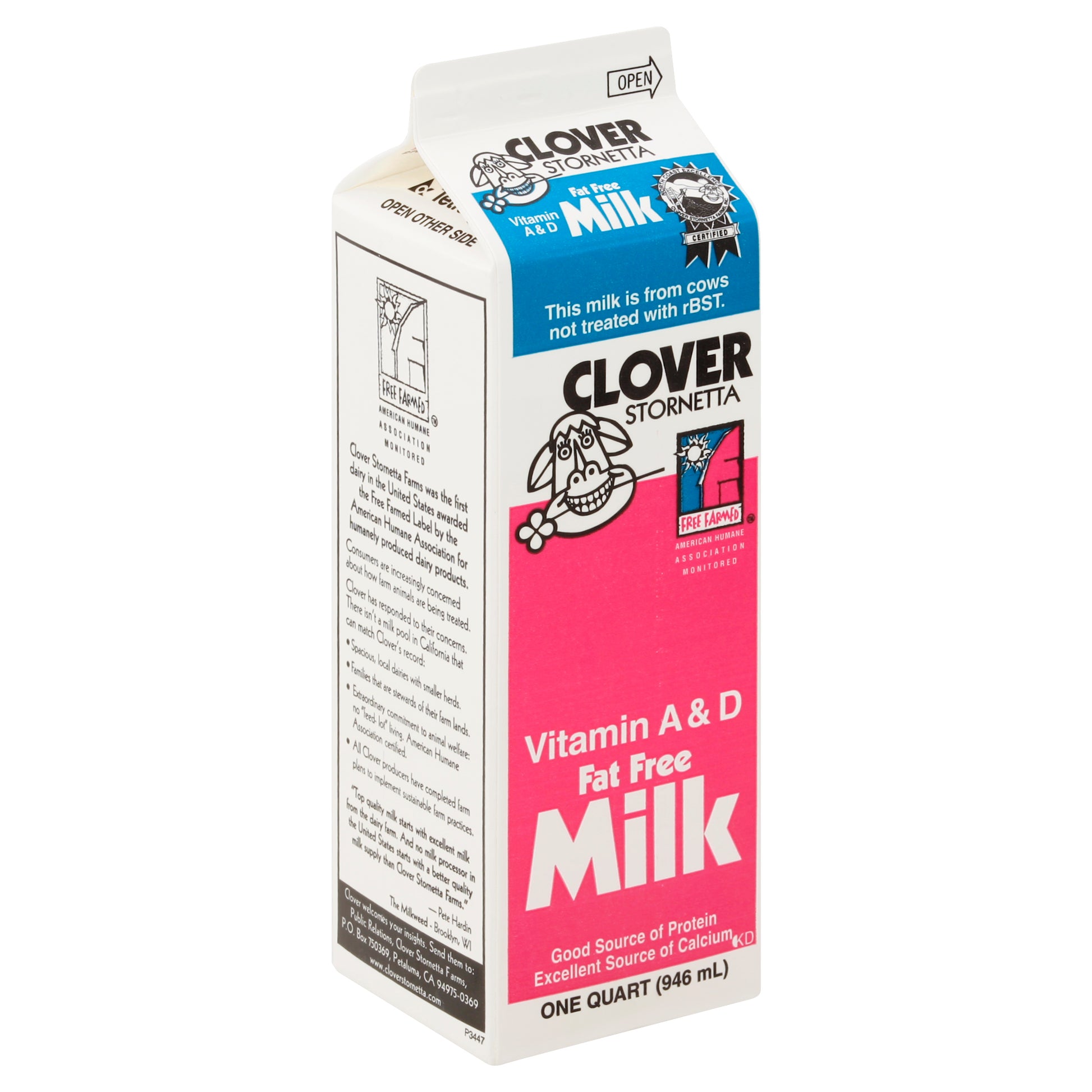 Vitamin A & D. North Coast Excellence certified. This milk is from cows not treated with rBST. Free farmed. American Humane Association monitored. Good source of protein. Excellent source of calcium. Grade A pasteurized. Homogenized. Fat free milk. Vitamin A & D added. Clover Stornetta Farms was the first dairy in the United States awarded the Free Farmed label by the American Humane Association for humanely produced dairy products. Consumers are increasingly concerned about how farm animals are being treated. Clover has responded to their concerns. There isn't a milk pool in California that can match Clover's record: Spacious, local dairies with smaller herds. Families that are stewards of their farm lands. Extraordinary commitment to animal welfare: no feed-lot living. American Humane Association certified. All Clover producers have completed farm plans to implement sustainable farm practices. Top quality milk starts with excellent milk from the dairy farm. And no milk processor in the United States starts with a better quality milk supply than Clover Stornetta Farms - Pete Hardin - The Milkweed - Brooklyn, WI.