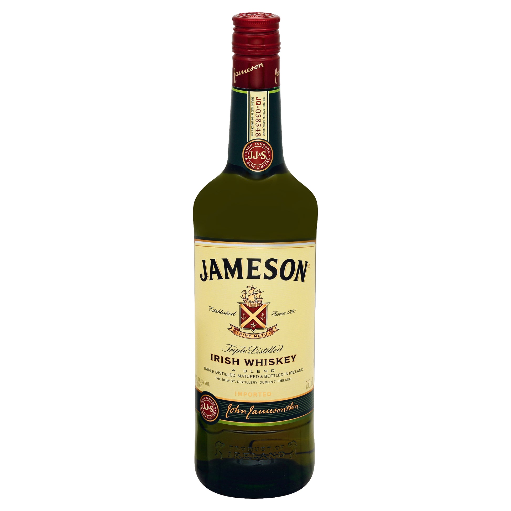 A blend. Imported. Triple distilled by John Jameson & Son. Established since 1780. Our family motto, Sine Metu, means without fear. In 1780 , it inspired John Jameson to found his distillery at Bow Street. Today it inspires us to carry on his legacy; smooth whiskey, triple distilled and aged at our home in Midleton, Co. Cork. Here's to a motto being more than words. Visit responsibly.org. jamesonwhiskey.com. 40% alc. by vol. (80 proof). Triple distilled, matured & bottled in Ireland. Product of Midleton Co Cork, Ireland.
