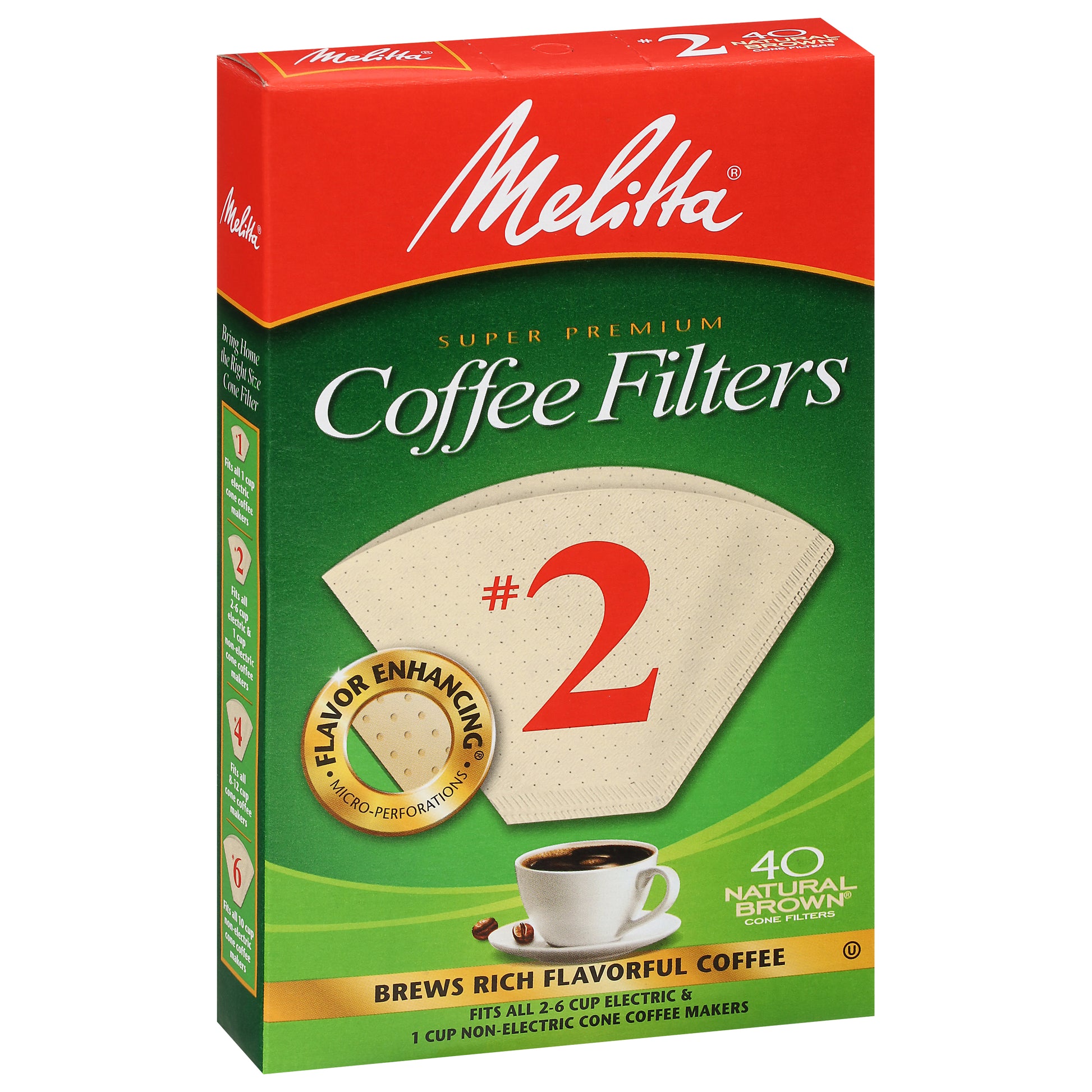 Flavor enhancing. Micro-perforations. Brews rich flavorful coffee. Fits all 2-6 electric & 1 cup non-electric cone coffee makers. Add More Flavor to Your Life: Microfine Flavor Enhancing perforations allow the full coffee flavor to filter through for a rich, flavorful cup of coffee. Compostable. Our double crimped filter design helps protect against bursting. The Original Pour-Over. Melitta Bentz, Founder and Inventor. It was 1908 when a German housewife, Melitta Bentz, made coffee history. Tired of the bitterness and troublesome grounds in her daily brew, Melitta poked holes in the bottom of a brass cup and lined it with a sheet of her son's blotting paper. She then filled the cup with ground coffee and poured in hot water, thereby creating the pour-over filtration system. The result - rich flavorful coffee without bitterness or mess. This innovation changed the way people worldwide make their coffee, becoming the precursor to modern day drip coffee brewing. Over 100 years later, Melitta remains dedicated to the pursuit of the perfect cup of coffee. Bring Home the Right Size Cone Filter: No. 1: Fits all 1 cup electric cone coffee makers. No. 2: Fits all 2-6 cup electric & 1 cup non-electric cone coffee makers. No. 4: Fits all 8-12 cup cone coffee makers. No. 6: Fits all 10 cup non-electric cone coffee makers. Global Releaf: Melitta is proud to be part of the Global ReLeaf program by making an annual donation to support this national education and action campaign aimed at improving the earth's environment one tree at a time. americanforests.org.