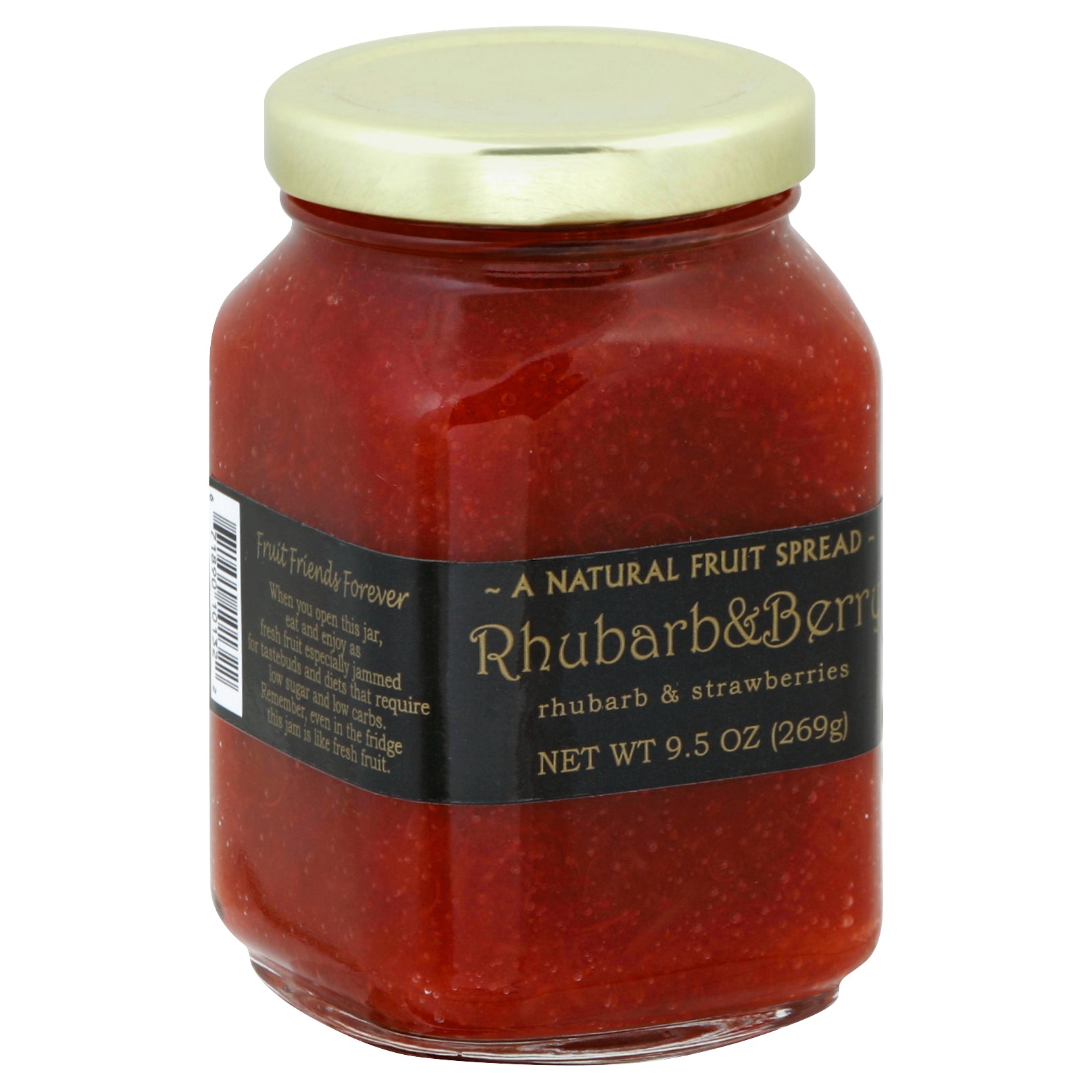 Rhubarb & strawberries. A natural fruit spread. Fruit Friends Forever: When you open this jar, eat and enjoy as fresh fruit especially jammed for tastebuds and diets that require low sugar and low carbs. Remember, even in the fridge this jam is like fresh fruit.