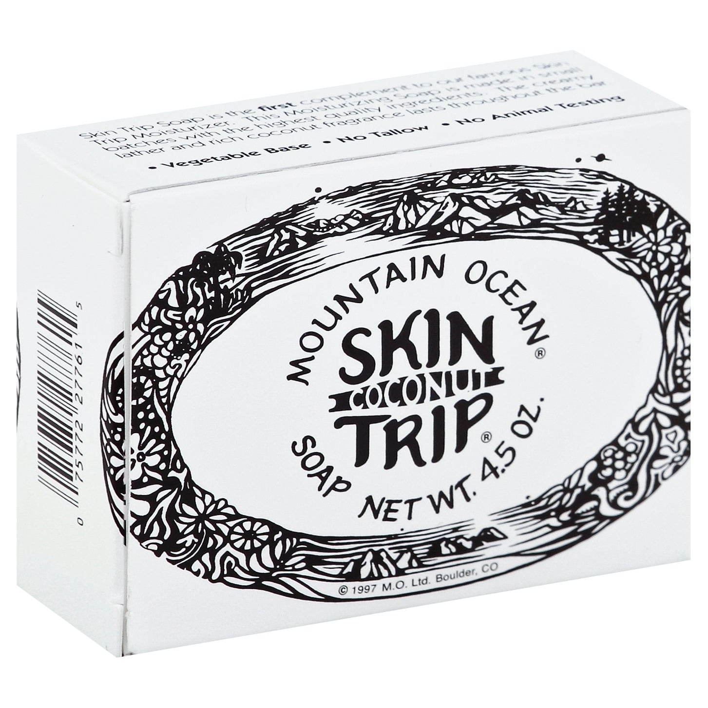 Skin Trip Soap is the first complement to our famous Skin Trip moisturizer. This moisturizing soap is made in small batches with the highest quality ingredients. The creamy lather and rich coconut fragrance lasts throughout the bar. Vegetable base. No tallow. No animal testing. www.mountainocean.com. Recycled paper.
