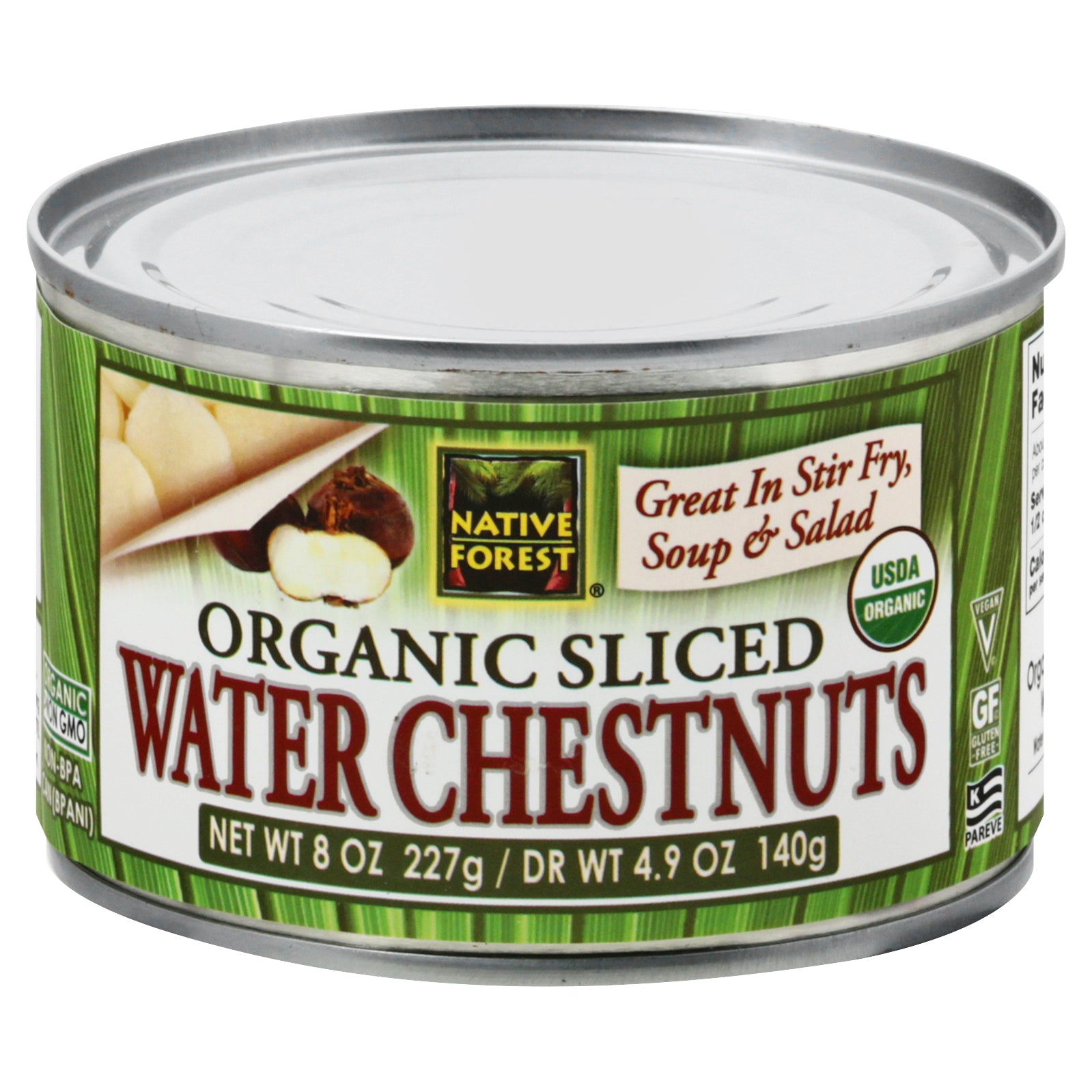 Great in stir fry, soup & salad. USDA Organic. Vegan. Gluten free. Certified Organic by QAI. Water chestnuts are a gluten free food. Organic greater than GMO. Native forest Organic sliced water chestnuts are delicious, slightly nutty tasting vegetables that lend their refreshingly crisp character to many favorite recipes. Add them to soup or stir fry for an authentic Asian flair. A family-owned vegetarian company offering convenience without compromise since 1978. edwardandsons.com. Get to know us better at edwardandsons.com. See delicious recipes at edwardandsonsrecipes.org. Non BPA. Product of China.
