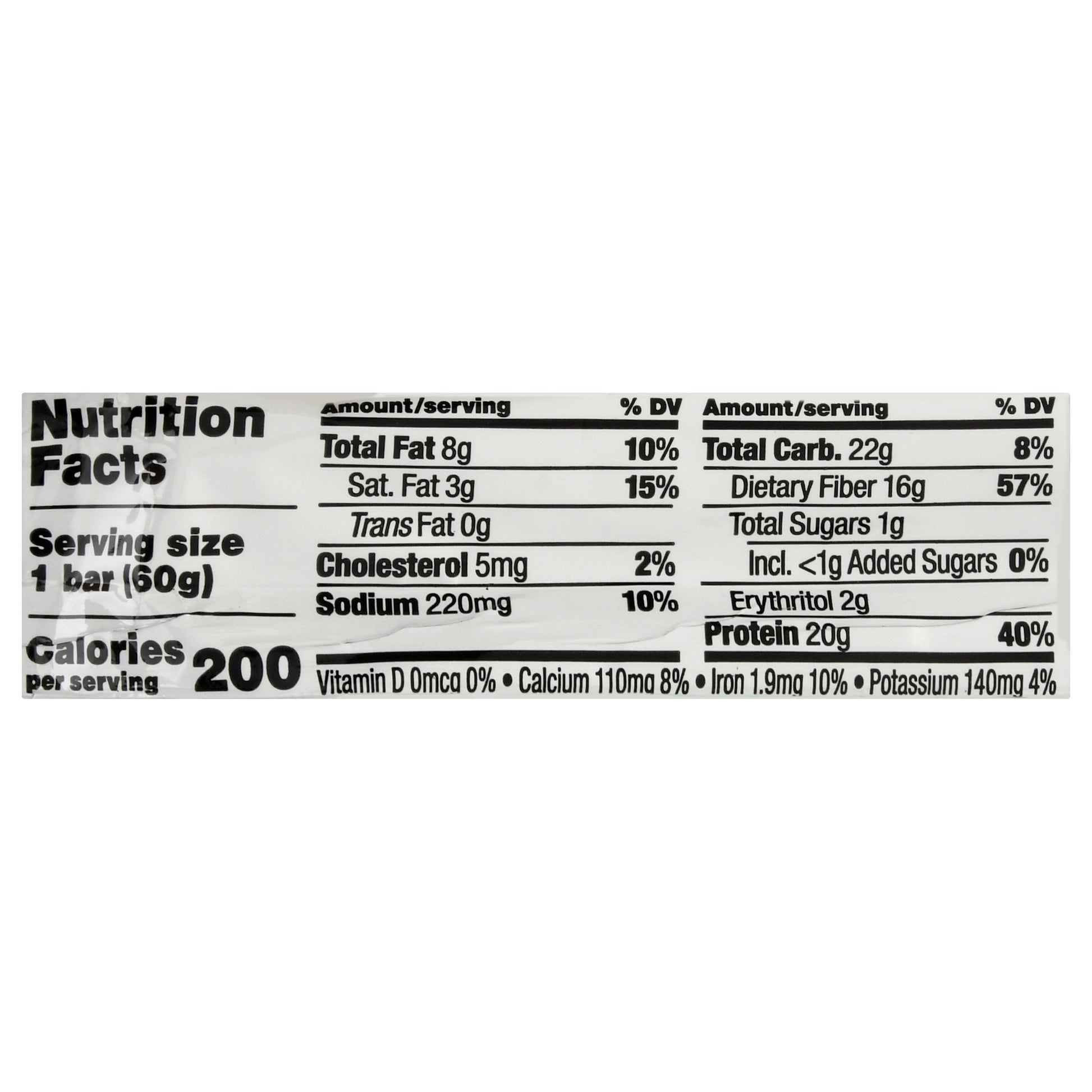 20 g protein. 4 g net carbs (24 g carbs - 14 g fiber - 6 g erythritol = 4 g net carbs). 1 g sugar. 16 g fiber per bar. See nutrition facts for calories and total fat contents. Certified Gluten-Free. questnutrition.com. (at)questnutrition. (hashtag)onaquest. Instagram. Facebook. Twitter. YouTube. Made in USA with domestic and imported ingredients.