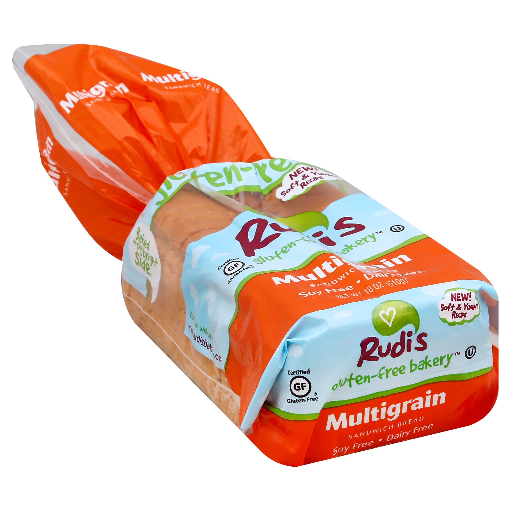 New! Soft & yummy recipe. Certified gluten-free. Soy free. Dairy free. Baked on the bright side. Visit our website: www.rudisbakery.com. Grab life by the slice. Taste what you've been missing! Guaranteed to be goodness-filled, and gluten-free. www.rudisbakery.com. Baked on the Bright Side: We've been baking on the bright side since 1976, so we knew we could make gluten-free bread taste just like real bread. We used a little gluten-free flour power and combined it with rich flaxseed and hearty millet for a homemade taste you'll want to share with your friends. Add your favorite ingredients for a sandwich to make you smile. 4 g fiber; 110 calories per serving. Know what's in your dough. Nut free. Non-GMO. Gluten-free, Goodness Loaded: Made with simple, light, fluffy ingredients and a generous helping of sunshine. No junk! www.rudisglutenfreebakery.com. Facebook: /rudisglutenfreebakery. Made in the USA.