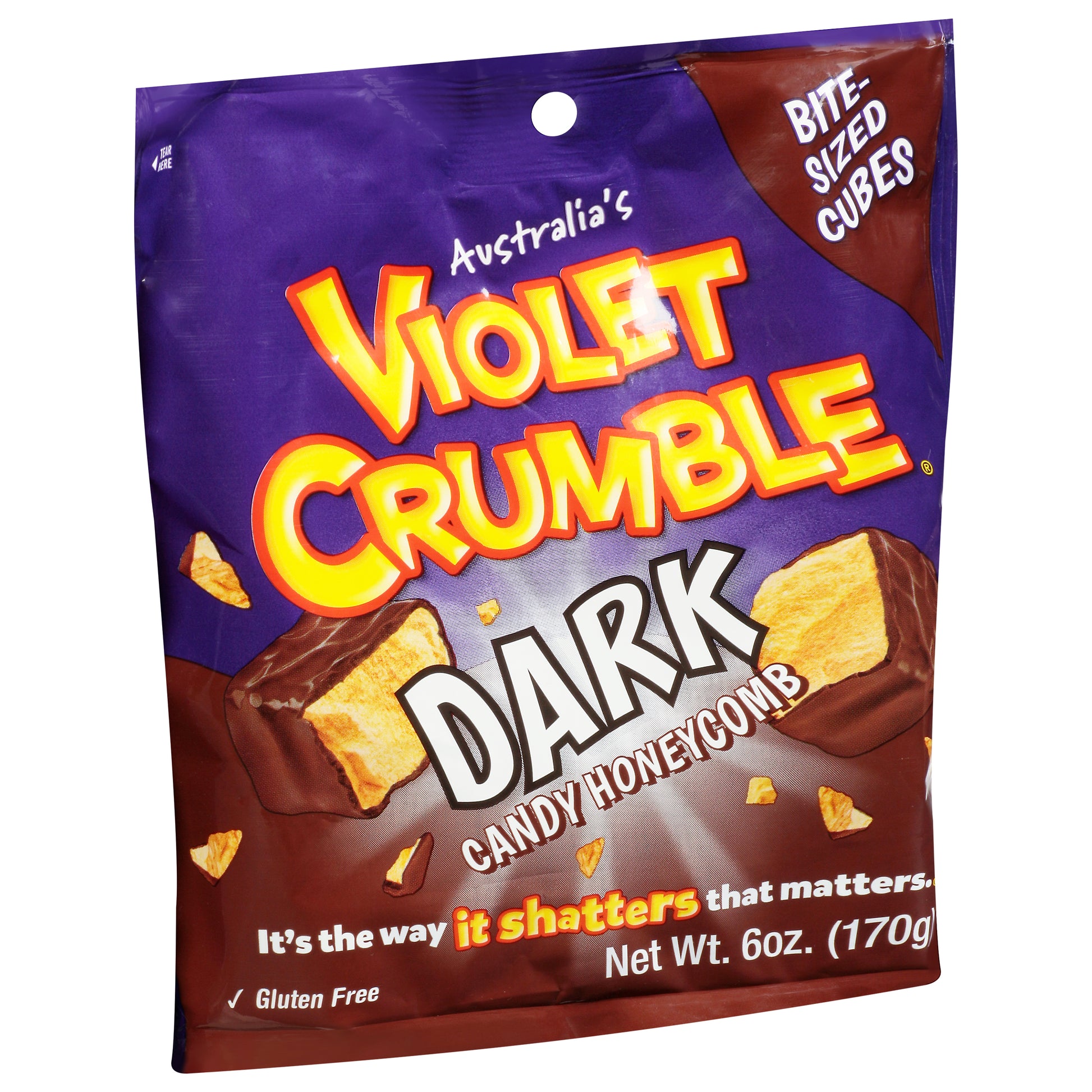 It's the way it shatters that matters. Delicious Shattering Dark Candy Honeycomb: There's nothing quite like a Violet Crumble! Delicious candy honeycomb with a moreish dark chocolate flavored candy coating from the land down under. Aussies have loved this earth shattering treat since 1913. Proving to this day that it's always been the way it shatters that matters!